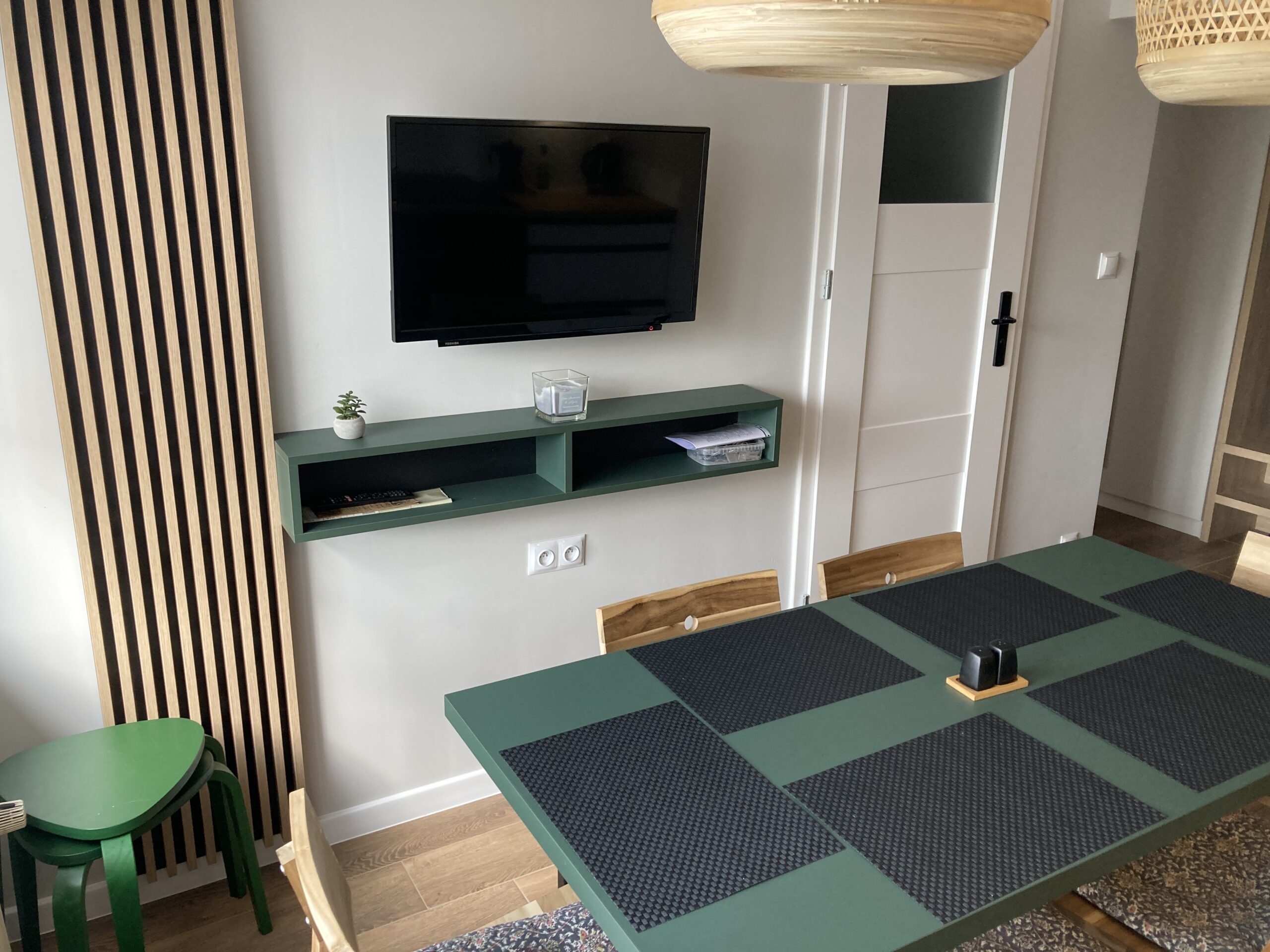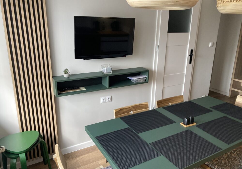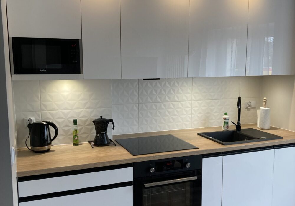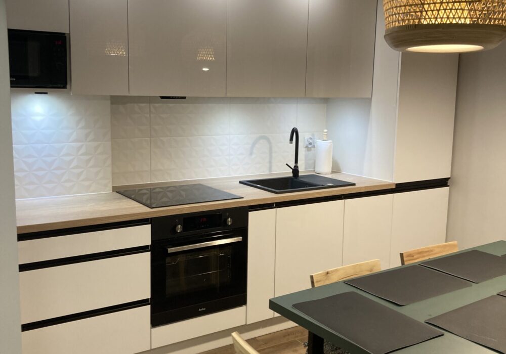 W każdym z pokoi apartamentu znajduje się: łóżko małżeńskie oraz rozkładana 2- osobowa sofa. Nowa kuchnia z pełnym wyposażeniem tj.: meble kuchenne, stół, 8 krzeseł, lodówko-zamrażarka, płyta indukcyjna, piekarnik, okap, mikrofalówka, zmywarka, czajnik, itp.. W pokojach szafy z drzwiami przesuwnymi. Łazienka z prysznicem, w pełni wyposażona. W lokalu dodatkowo: telewizor smart, WI-FI, pralka, odkurzacz i inne drobne wyposażenie. W apartamencie może jednocześnie nocować do 8 osób. Rekomendowane są pary bądź po dwie rodziny z dziećmi.
